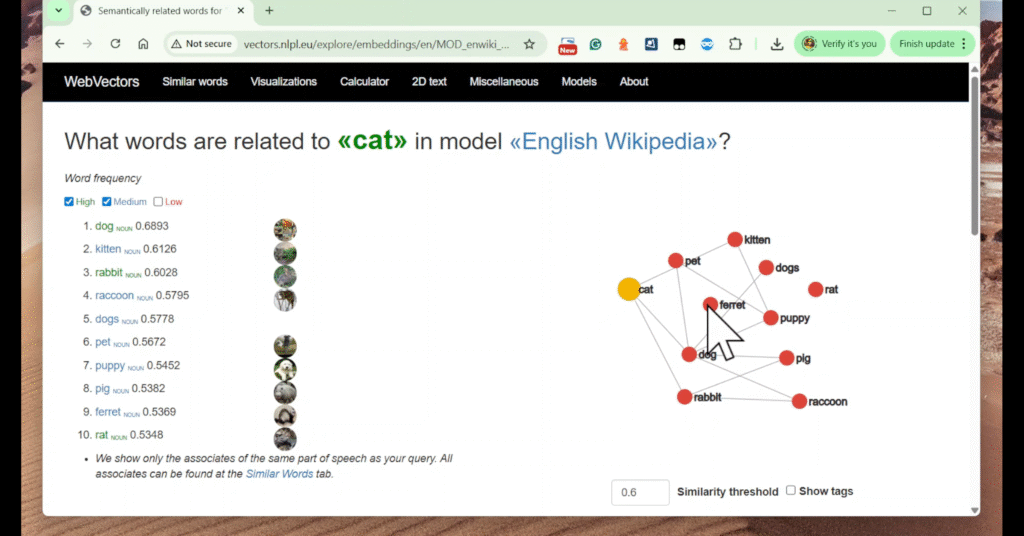 例如,在向量空间中,离“cat”最近的单词包括“dog”和“pet”。