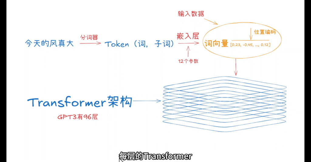 具体来说,Transformer 通过引入一种叫“注意力机制”的方法,重点关注句子中相关的词,从而像人一样“思考”上下文。当大语言模型拿到一段文本资料后,分词器会将文本拆成小块(也叫“词”或“子词”),如 [“今”, “天”, “的”, “风”, “真”, “大”, “。”],也就是我们常说的 token。然后,嵌入层(Embedding Layer)中有一个词汇表,每个词会对应一个向量,嵌入层通过查表将每个字符(比如“风”)变成一个初始词向量,比如一个 12,288 维的词向量 [0.23, -0.45, …, 0.12]。