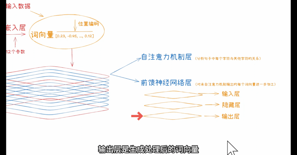 • 输出层:生成处理后的词向量(GPT-3 仍是 12,288 维),传递到下一层 Transformer。