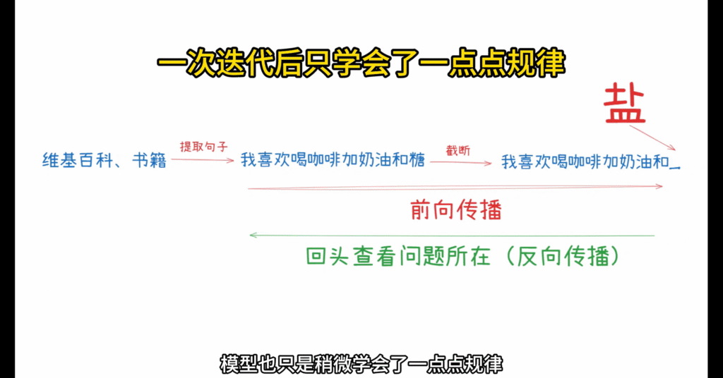 最开始,模型完全不懂语言,所有参数都是随机的,就像一个刚出生的婴儿,猜词全靠蒙。因此,它可能会猜是“盐”,明显不对。于是,模型会“回头看”整个计算过程,找出哪些权重导致了错误,然后稍微调整这些权重参数,这就是反向传播(Back Propagation)