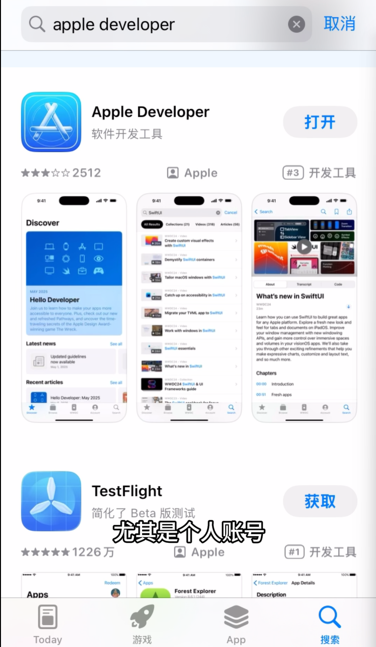 - 在 App Store 搜索 Apple Developer(注意是这个蓝色图标的官方 App,不是 Xcode)