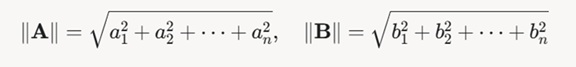 - 除数是向量 a 的欧几里得范数(‖a‖)与向量 b 的欧几里得范数(‖b‖)的乘积。向量的欧几里得范数就像是向量的‘身高’,它用于归一化向量A和B的点积,确保结果只反映向量方向的相似性,而不受向量长度影响。