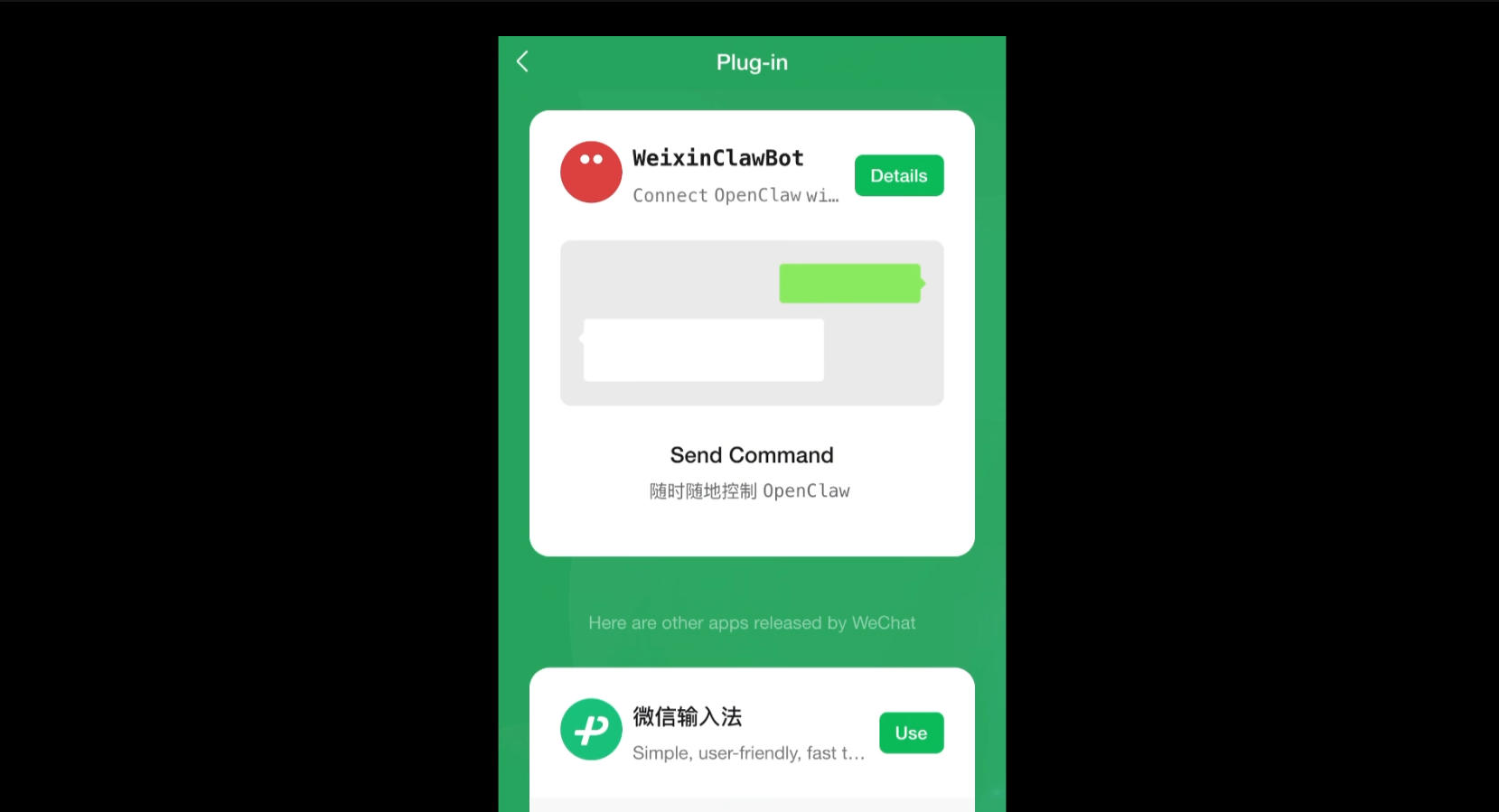 连接成功后,会自动进入「微信 ClawBot」的聊天界面。